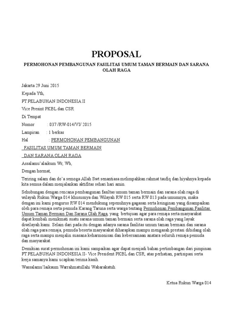 5. Penutup: Pada bagian ini, tuliskan ucapan terima kasih atas perhatian camat dan harapan agar permohonan bantuan bisa dipenuhi. Contoh: Demikian permohonan bantuan alat olah raga dari kami, atas perhatian dan kerjasama Bapak/Ibu Camat kami ucapkan terima kasih. Semoga permohonan ini bisa dipenuhi.